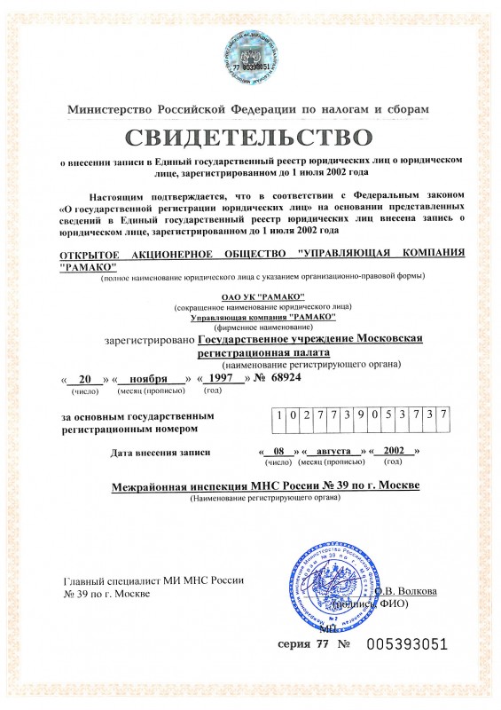 Свидетельство о внесении записи в Единый государственный реестр юридических лиц