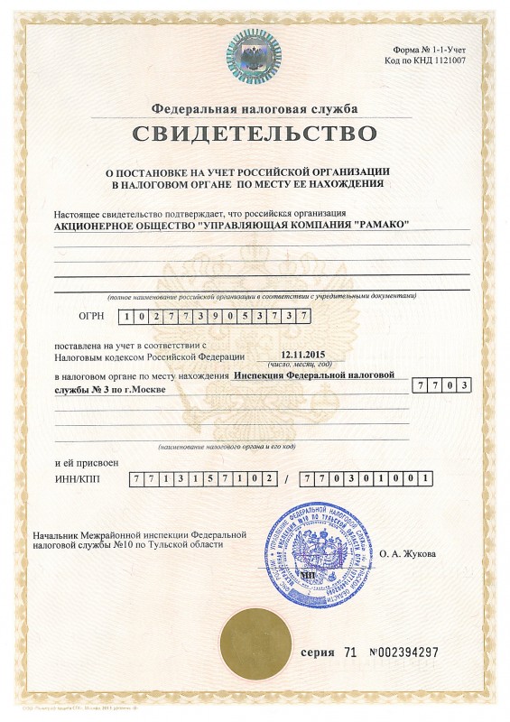 Свидетельство о постановке на учет в налоговом органе